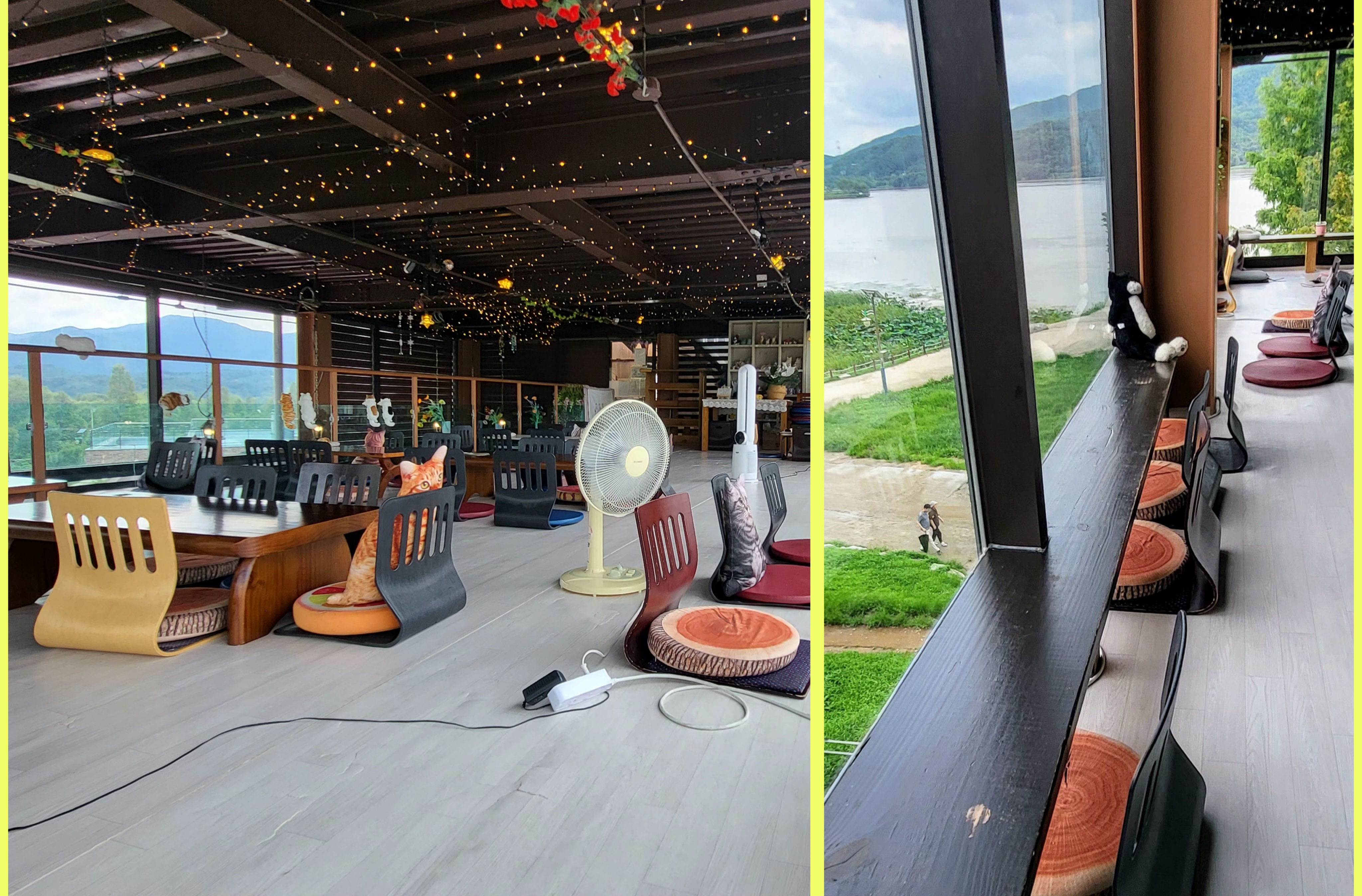 다른 손님들이 없어서 조용한 방에 고양이와 강아지 쿠션이 자거나 쉬고 있다.