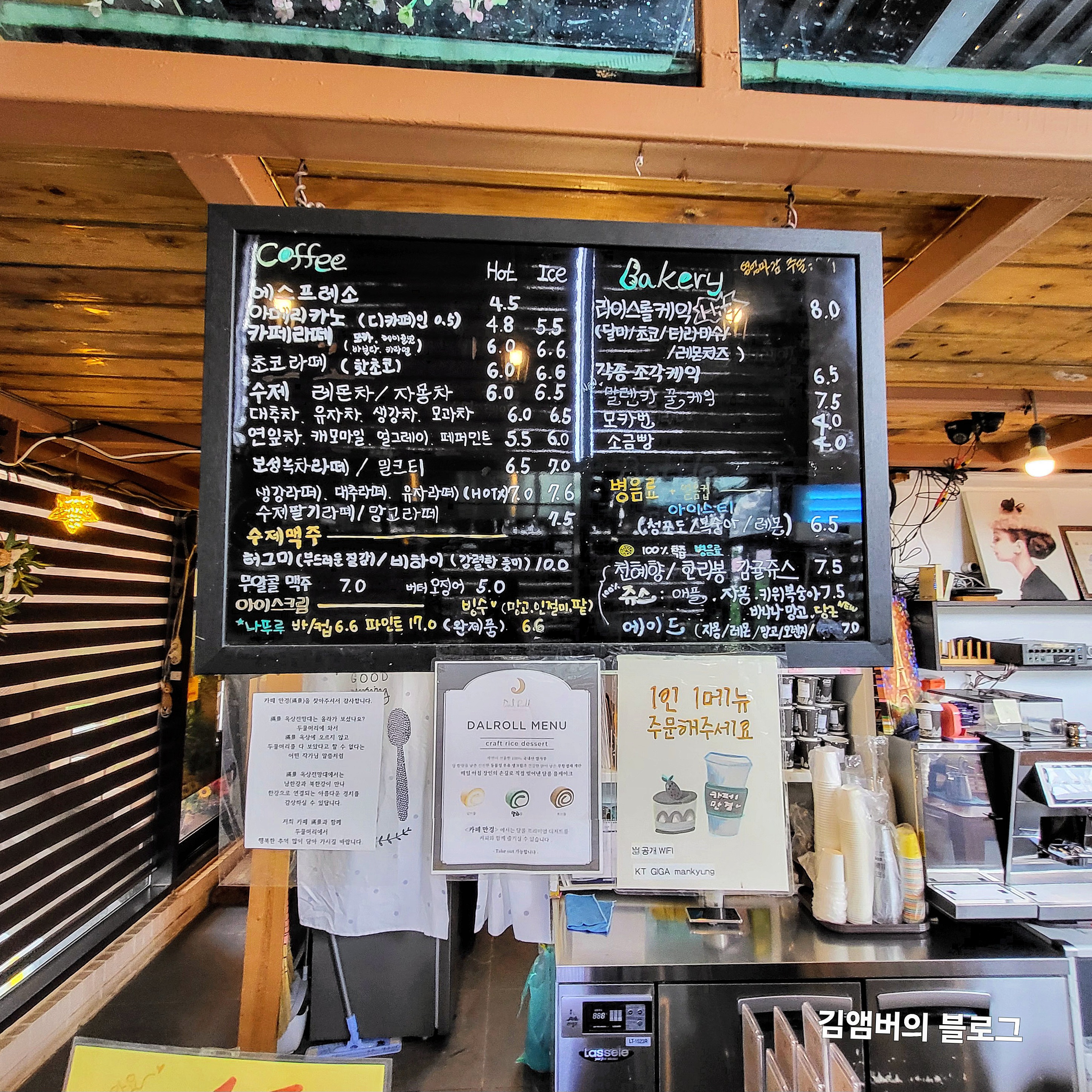 입구 바로 앞의 카운터에 메뉴판이 걸려있는데 물어볼 것도 없이 얼음 많이 넣은 아이스아메리카노다.