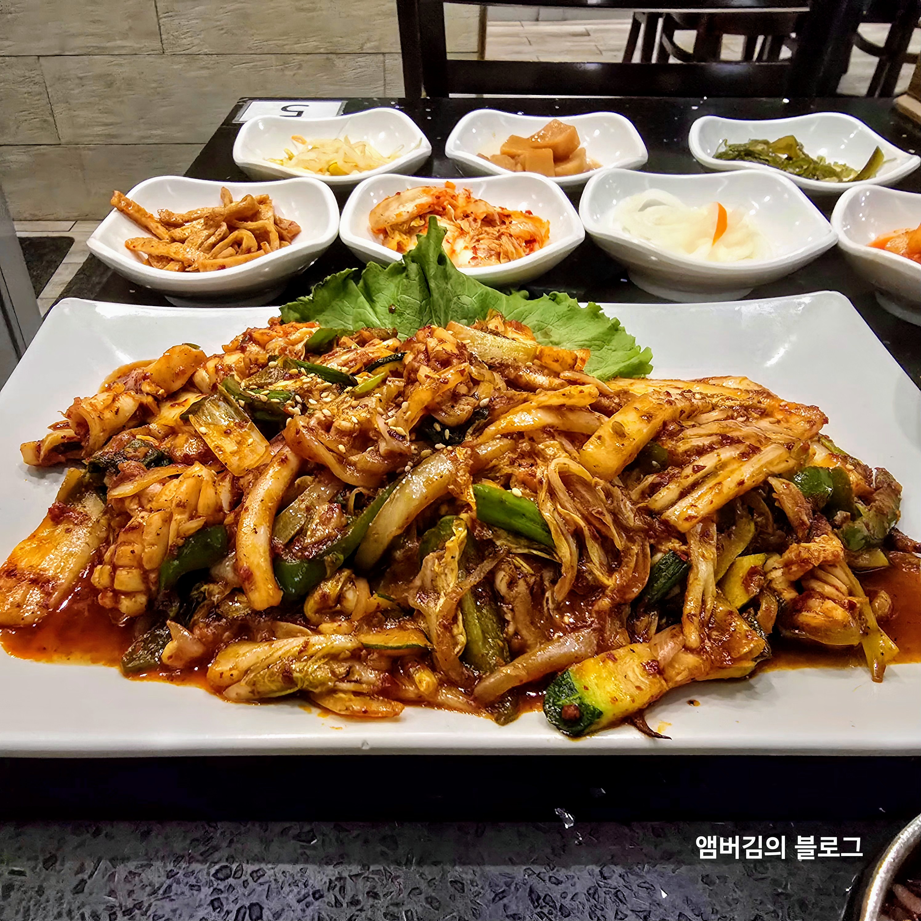 커다란 접시에 오징어 볶음이 나왔는데 두세 명이 충분히 먹을 정도로 양이